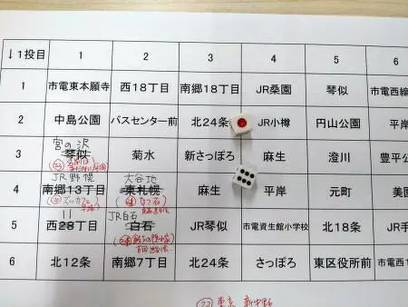 飲みながら突然思いついたこのゲームのルールを簡単に言うと、ビンゴカード状のマスに札幌の地下鉄駅名を縦6×横6の合計36駅を書き出して、二回サイコロを振り、出た目の駅の周辺を歩き回って、良さそうな店を探して飲んでみるというものなんですね。
