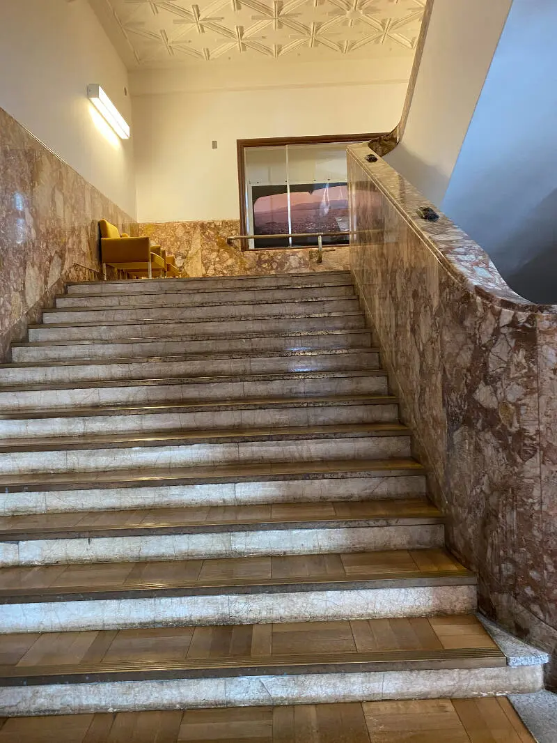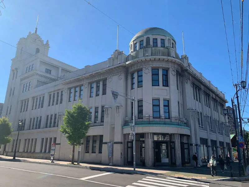 現在、「函館市地域交流まちづくりセンター」として市民に親しまれているこの建物は、元々は丸井今井百貨店函館支店だった建築物。1923(大正12)年築の、鉄筋コンクリート造3階建てですが、後ろ側にその後増築された7階建ての一部分が残っております。階段や天井の高い室内など、随所に往時の趣きを偲ばせるこの建物内は、だれでも自由に見学することができます。街歩き前に少しだけ内覧させていただきました。