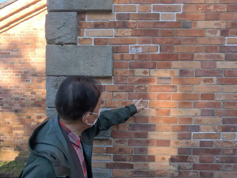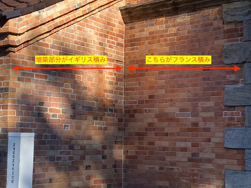 レンガの積み方には「フランス積み」と「イギリス積み」の2種類があります。フランス積みはレンガの小口と長手を1個ずつ交互に積み重ねます。イギリス積みはレンガを小口だけの段、長手だけの段と一段おきに並べる積み方です。これで何がわかるかというと、それぞれの技術が使われていた時代が異なるので、建てられた時代がおよそわかるそうです。日本では、フランス積みは1887(明治20)年以降ほとんど見られなくなったので、この建物のイギリス積みの部分は明治40年の大火後に増築されたということになります。