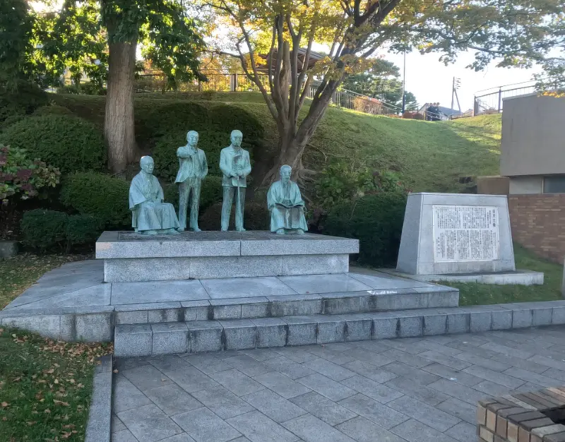 元町公園内には、旧北海道庁函館市庁庁舎があり、その横には、明治期の函館の経済や教育、医療の発展に私財を投じて尽力した、今井市右衛門、平田文右衛門、渡辺熊四郎、平塚時蔵の像があります。