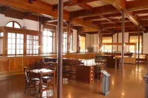 近世ヨーロッパ復興様式の石造2階建建築で、当時の最新設備の蒸気暖房やアメリカ製スチールシャッター、シャンデリアや金唐革紙の壁紙など贅をつくした建築物でした。