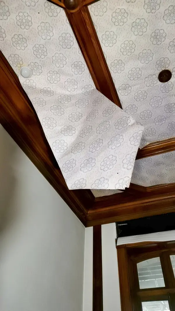 前回の大規模修理の際は、このペンキをはがそうとしたようですが断念し、印刷した壁紙を上から貼ったようです。