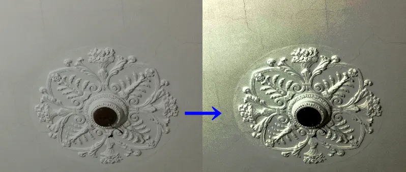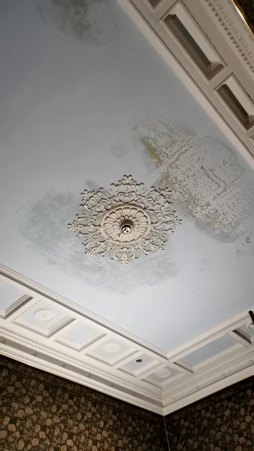 天井は薄いブルーでしたが、シミやヒビが入ってしまっています。