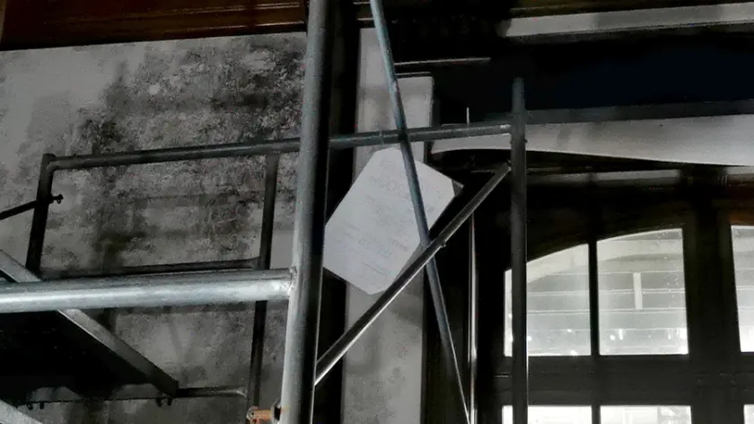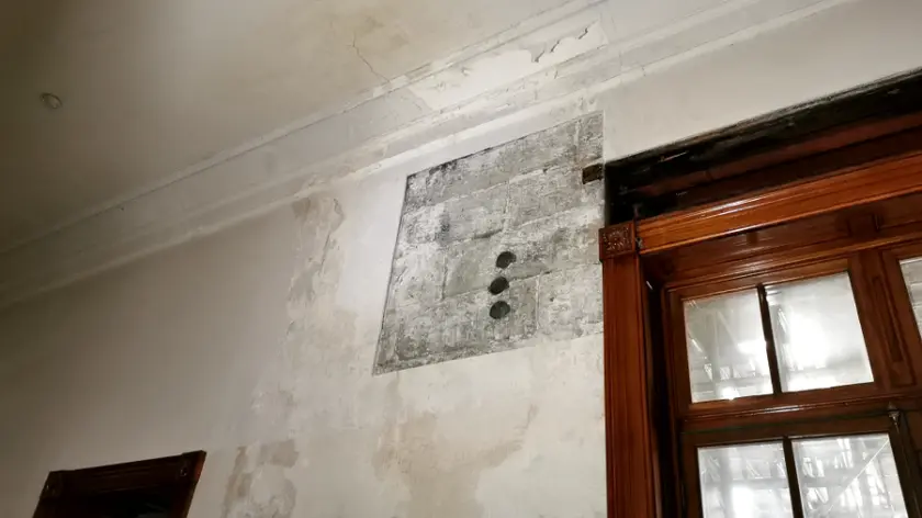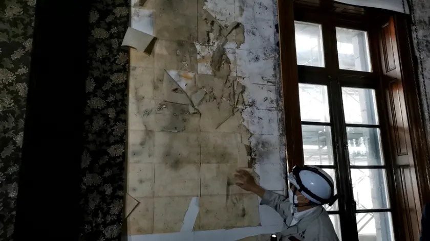 貴賓室近くの壁は、雨漏りが内部にしみ込んだことにより、壁紙が剥がれてきてしまっています。