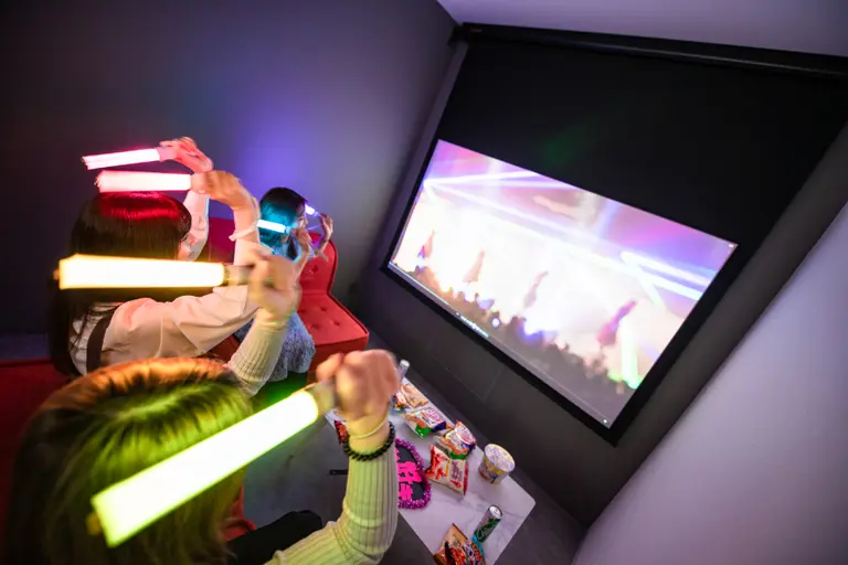 利用方法は無限大。今一番利用が多いのはアーティストのライブビューイングですが、スポーツ観戦や推し活&撮影会、映画やドラマの鑑賞会に利用されることもあります。なおドリンクやフードの持ち込みやデリバリーにも対応しているので、これからの季節、卒業パーティや送別会の予約も入ってきているそうです。気の合う仲間と飲食しながら思い出の動画を大画面で鑑賞するのもオススメです。予約サイトから予約が可能で、ご予約時にご要望をいただくと事前にレイアウトを変更してくれます。