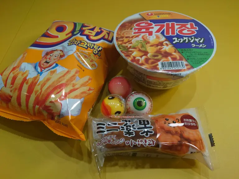 SNSで話題!の韓国グミ「ASMRグミ」各120円、韓国で人気のロングセラー商品「ユッケジャンラーメンカップ」150円、韓国の伝統菓子でほんのり香るシナモンの素朴な甘さが人気「広場のミニ薬菓(ヤッカ)」130円、淡泊で香ばしいじゃがいもの味が楽しめる当店スナック菓子人気NO.1の「オ!ガムジャ」170円。種類が豊富で気軽に色々な韓国グルメが楽しめるのは嬉しいですね。