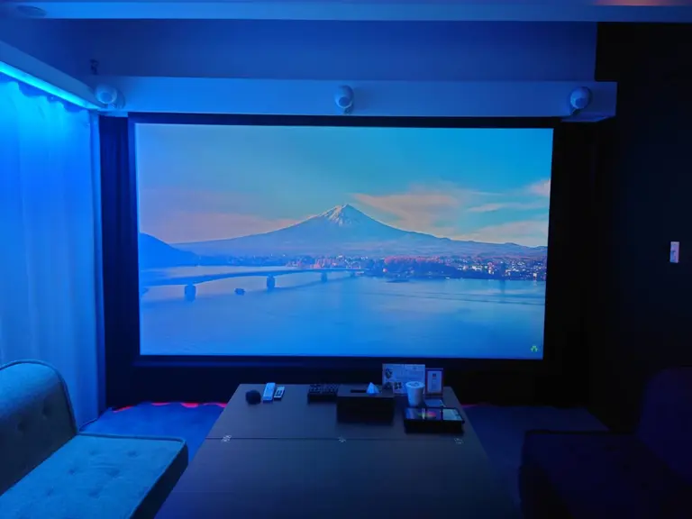 2Fはレンタルスペースで最大12名収容のBIGROOMと最大3名収容のSMALLROOMと2つの部屋があり、1時間からレンタルが可能です。部屋料金となっているので、人数が多ければ多いほどお得に利用できて、月毎に割引キャンペーンを実施。料金について詳しくは公式ホームページをご確認ください。各ルーム大型スクリーンに4Kプロジェクターを完備し、備え付けのipadやご自身のスマートフォンから好きな映像を鑑賞することができます。DVDやブルーレイを持ち込んでの視聴も可能です。