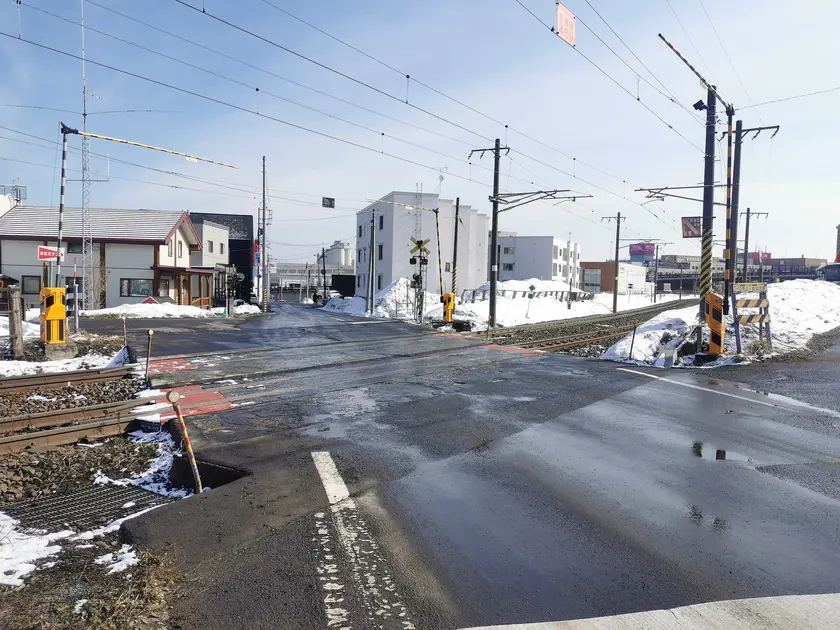 潮見台踏切(ケーズデンキ近く)の踏切を通ります。