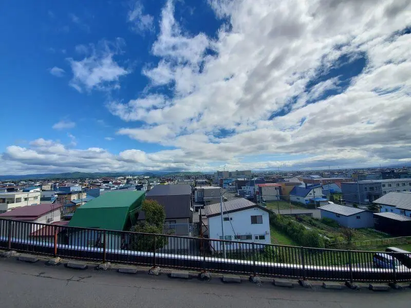 国道39号側から景色を見ると、カーディーラーの看板や男山酒造の看板まで、永山の住宅街側の景色を見るとずっと続く住宅街の奥に旭山公園の頂上にあるテレビ送信所の鉄塔まで眺めることができます。