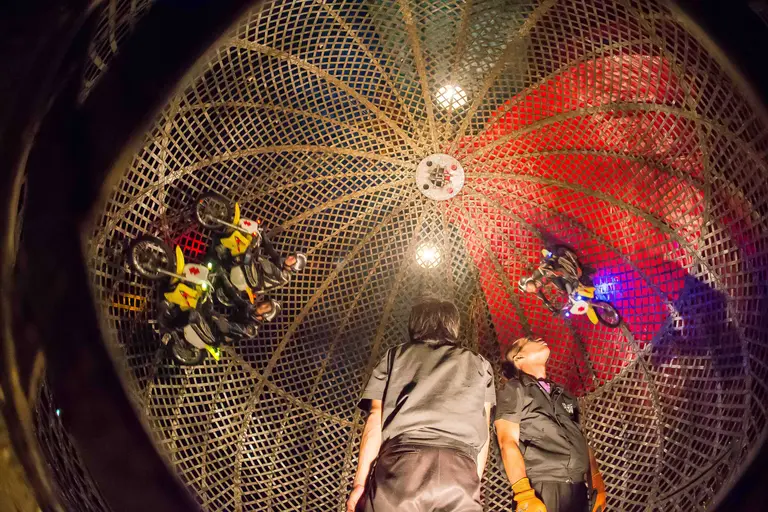 3組のバイクが交差するように回ったり、ぶつかるんじゃないかというスレスレを通り抜けたりと(しかも中央にはアシスタントのスタッフが入ったまま!)、まさに縦横無尽の演技を見せてくれます。