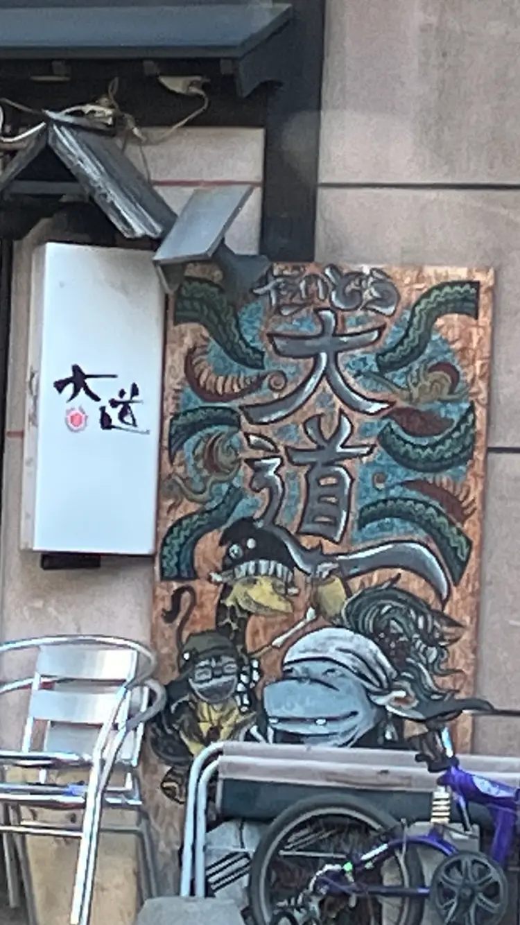 ダークな色調ですがキャラの表情が可愛い看板です。手書きの温かさがありますね。近くで ゆっくり見たくなります。