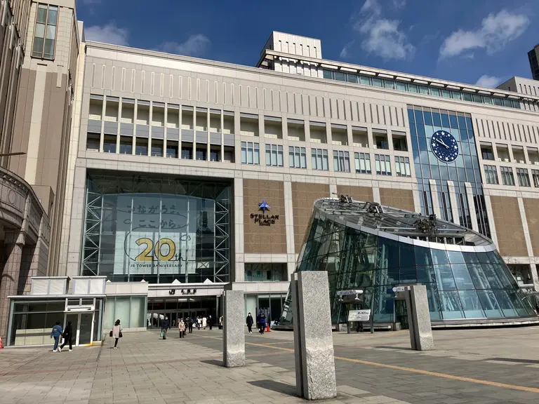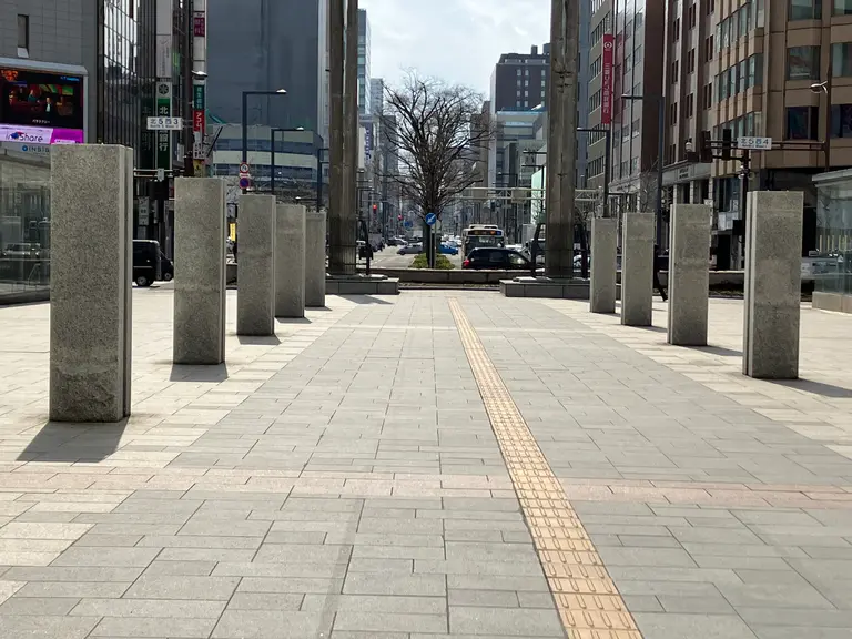 メンバー全員で、JR札幌駅南口駅前広場にある大理石柱のモニュメントの間を通ってJR札幌駅に向かいます。