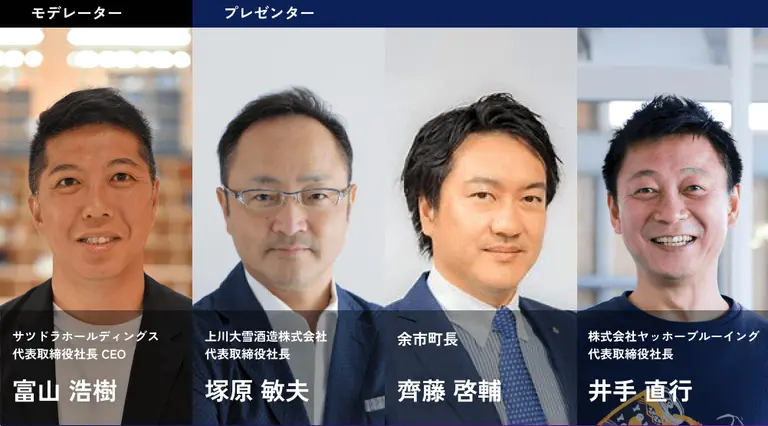「お酒」セッションの顔ぶれも超豪華!。北海道の酒造りに新風を吹き込んだ「上川大雪酒造」の塚原敏夫社長に、今や世界の美食家にも認められるワイン産地・余市の齊藤啓輔町長、さらにはエスコンフィールド北海道に世界の野球スタジアムで初めてブルワリーを作った「ヤッホーブルーイング」の井手直行社長。サツドラHDの富山浩樹CEOがモデレーターを務めました。