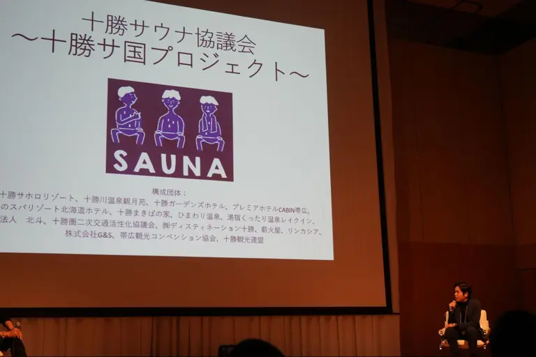 十勝サウナ協議会の後藤陽介会長は「十勝サ国プロジェクト」の取り組みを紹介。新得町の「くったり温泉レイク・イン」で真冬の屈足湖に穴をあけサウナの後に湖水につかる「アヴァント体験」を売り出したところ、冬場は休業していた施設が今では約7割の稼働率になったと報告しました。