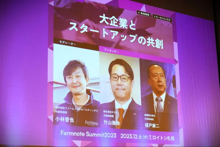 このセッションでは、大企業とスタートアップという対極にある組織同士の「共創(協業/コラボレーション)」の可能性について、ファームノートHD代表取締役の小林晋也さんがモデレーターとなり、これまで500件以上のスタートアップの上場支援を手掛けたタスク代表取締役の竹山徹弥さん、元パナソニック取締役で創援代表取締役の榎戸康二さんとディスカッションしました。