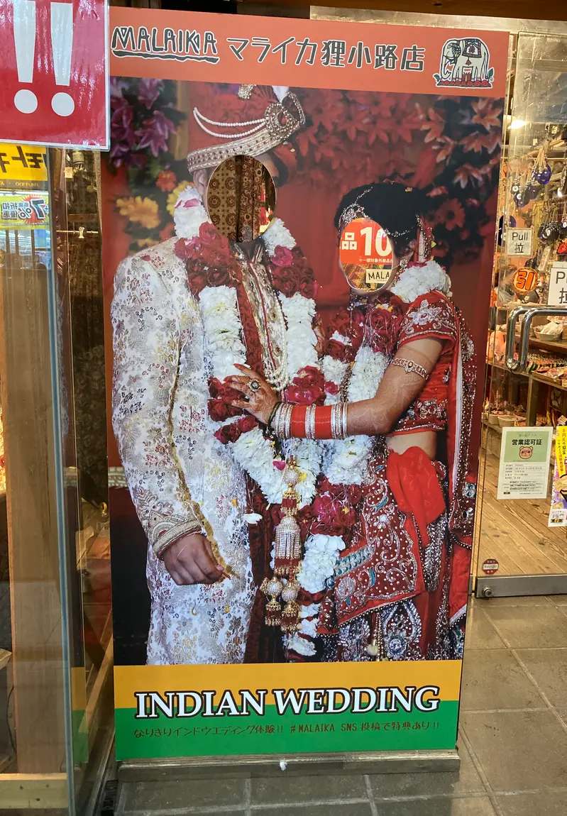 狸小路商店街にある「マライカ 狸小路店」入口にインディアンウエディングの顔はめパネルを発見!
