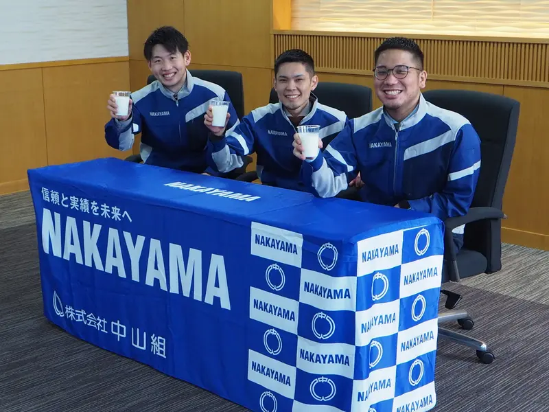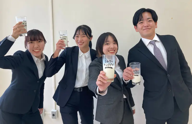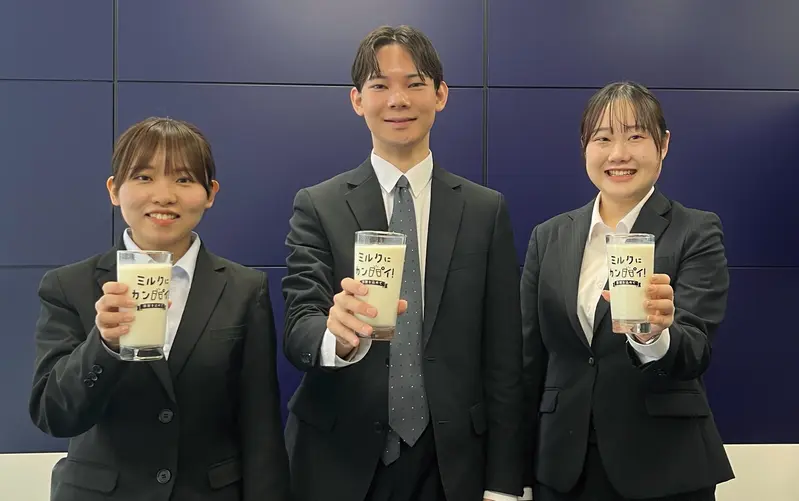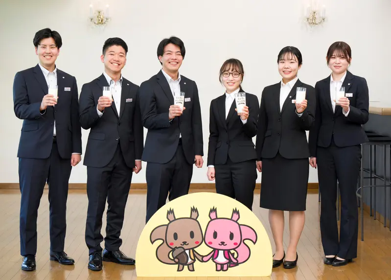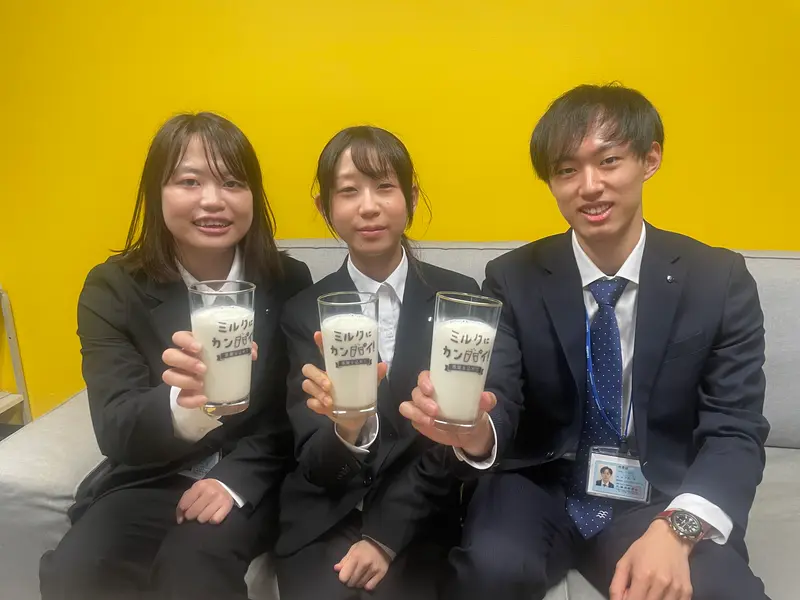 新人もベテランもみんな揃って牛乳でカンパイ!