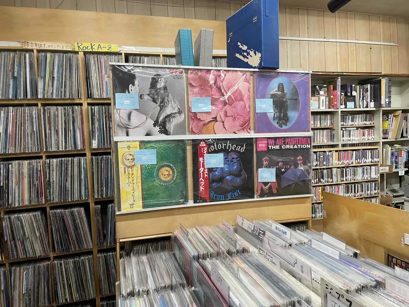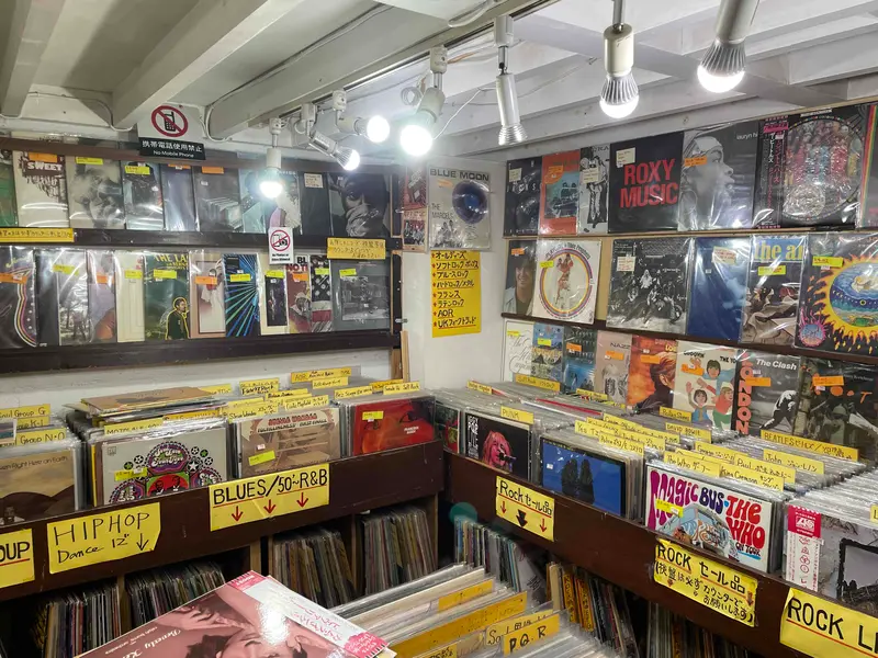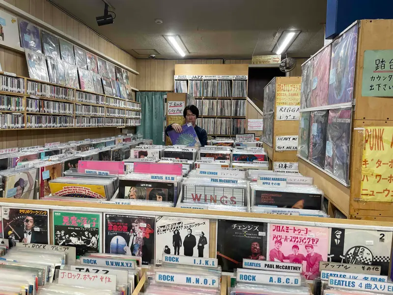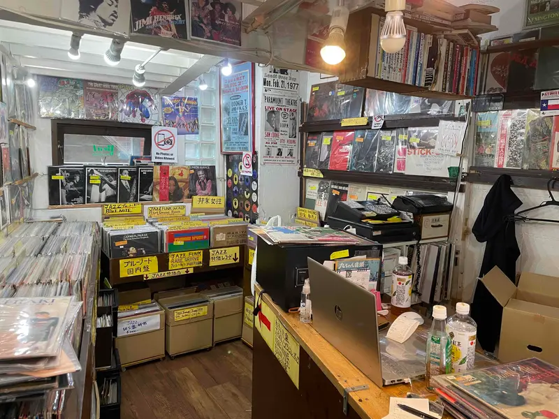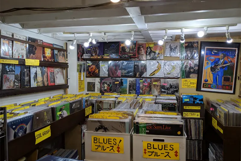 店舗内は所せましと一面レコードやCDで埋め尽くされています 棚もレコードの山です