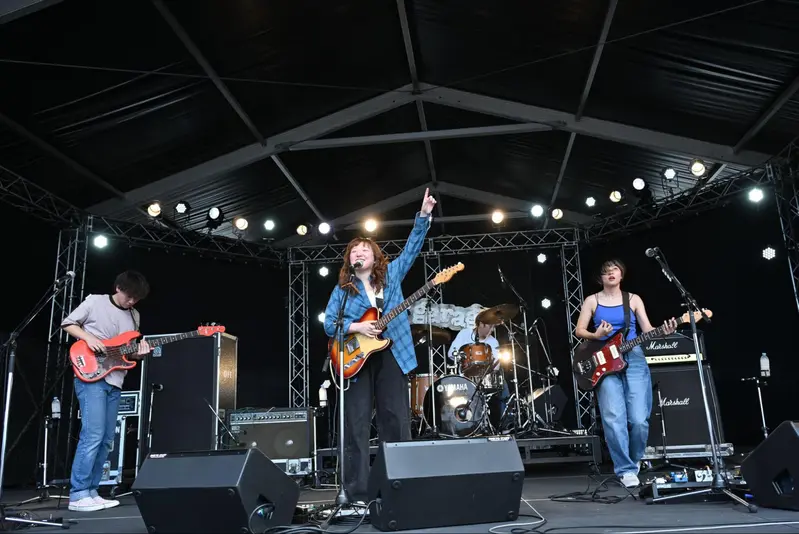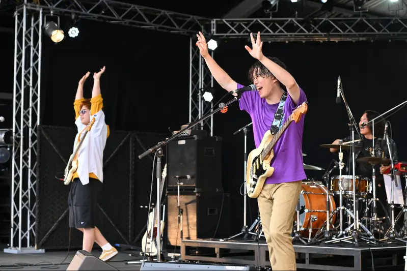 1日目の午後1時。SUN STAGEなど他の大型ステージに先駆け、野外の小型ステージ「def garage」が開演した。「RSR2024のトップバッター」として舞台に立ったのは、Rising Starの勝者「Hwyl(ヒュイル)」だ。ROCK IN JAPAN2023のオープニングアクトを務め、テレビやラジオでの露出も増えているスリーピースバンドだ。