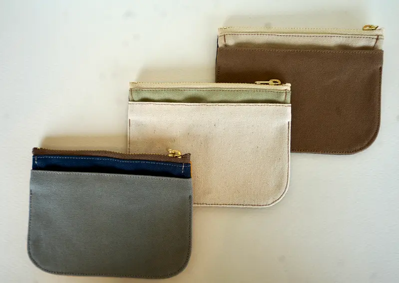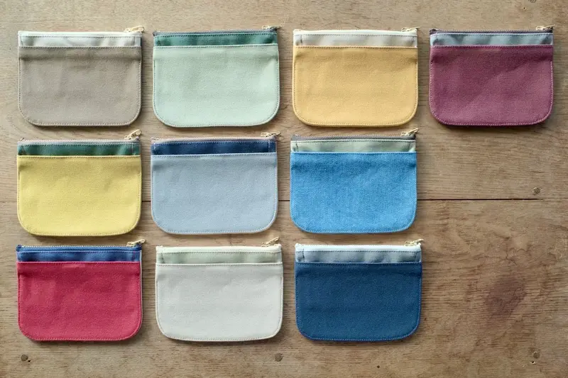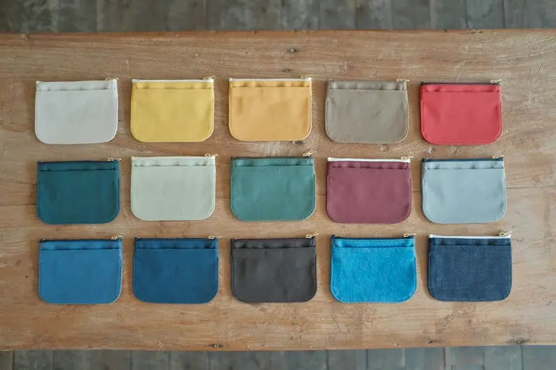 それぞれに名前が付けられていて、ポケットになっている面がバイカラーで裏と合わせると3色からなる「イロアソビ・シリーズ」と、無地の帆布でできているミニ財布の二種類があります。手にとってみると、どれも計算されつくした色で、選ぶのは簡単ではありません。