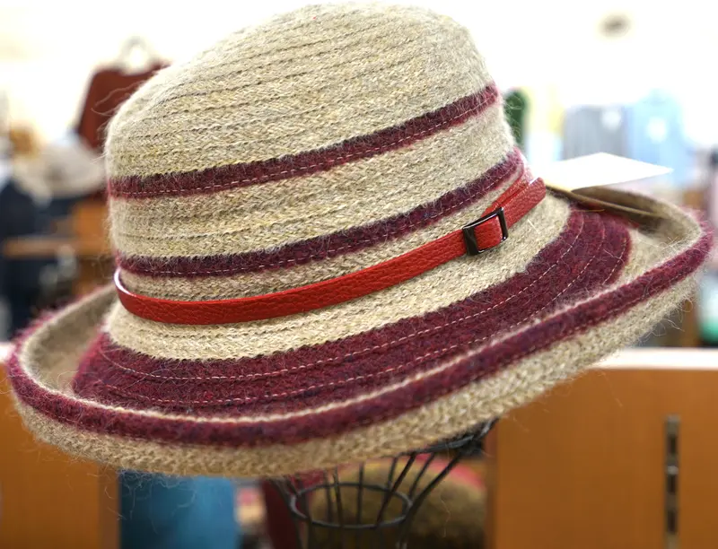 ブレード帽子もおすすめです。「石田製帽」の原点ともいえるブレード帽子。従来から、「石田製帽」では、イタリアから様々な色のウール糸を仕入れて、ブレードを組み立て、帽子に仕上げているとのこと。