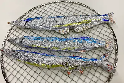 秋の味覚サンマをアルミホイルでたくさん作り、会場に「大漁オブジェ」として展示するプロジェクトです。