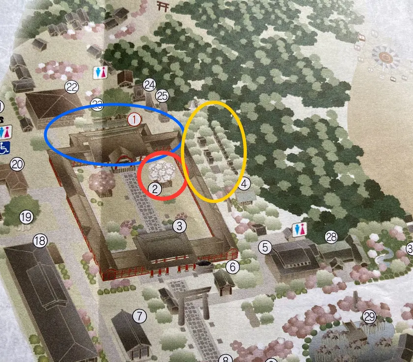 以下の画像は以前撮影した画像で、梅の花と巨大絵馬が置かれる場所を示しています。