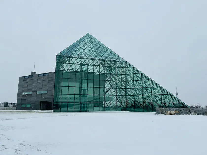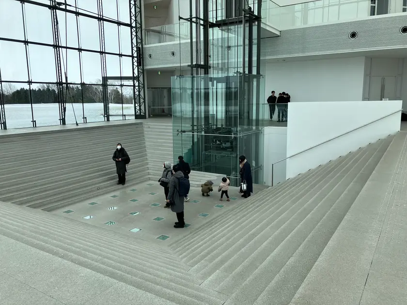 広大な敷地のモエレ沼公園内の一際目立つ建造物がガラスのピラミッド。薄い水色に光って見えます。俄然、中が気になります!