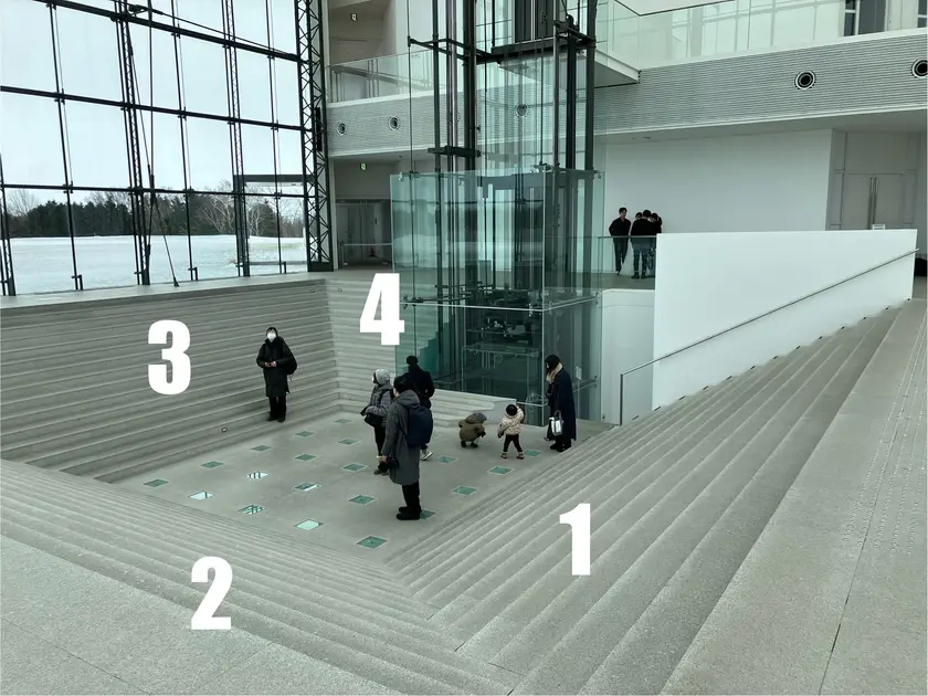 左:一段の高さは15センチほど。腰掛けたら2段を使って足を下ろすような感じに座りました。 右:会場アナウンスで4の場所は座らないように指示がありました。またステージが見えにくい3のステージ側、同じく1のステージ側も端まで座らない方がいいかもです。
