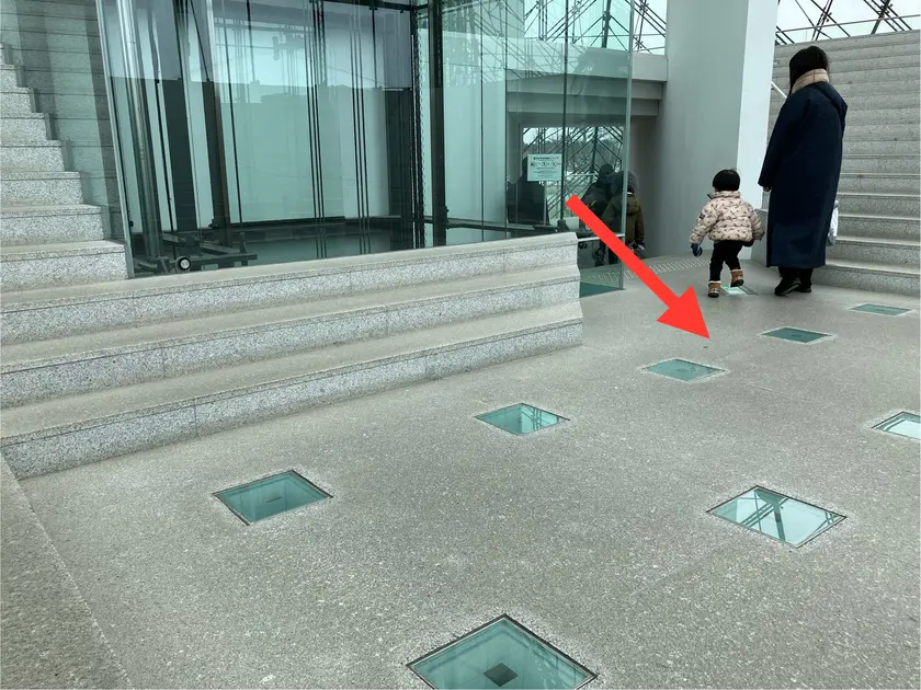 ・入口から「アトリウム2」への進路に赤→をつけました。上杉さんのライブの場合は、整理番号No.1の方が階段最上段で、以降番号順に階段から「アトリウム1」のスペースへ列が伸びました。