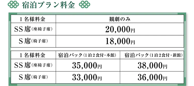 本公演は、「観劇のみ」と「宿泊パック」のどちらかをお選びいただけます。ご宿泊される場合には、定山渓温泉や昨年リニューアルしたサウナ、屋内温水アミューズメント「水の王国・ラグーン」プールなど定山渓ビューホテルの全施設をご堪能いただけます。