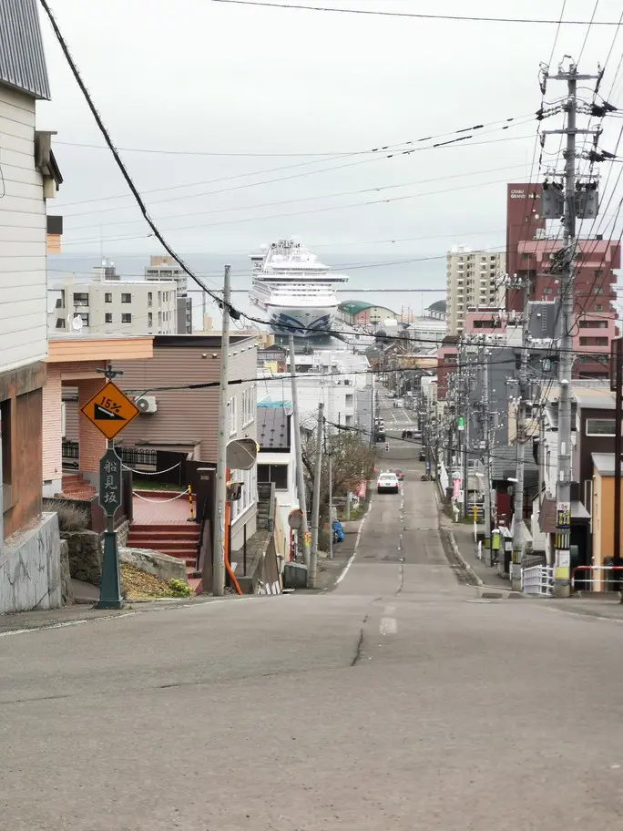 船見坂の由来は船が見えることから。小樽の第3ふ頭に船が停泊すると画像のように見えます。