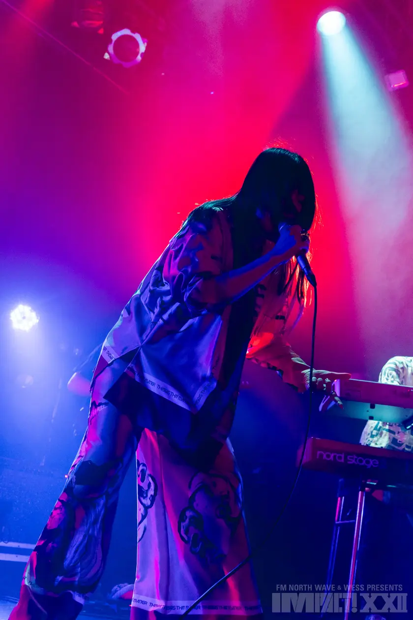 1曲目はループするギターリフがライブの始まりに相応しい壮大さを助長する「フラッシュバック」。隙間の多めな譜割りのメロディが非常に気持ちいい。お客さんのレスポンスの良さから楽曲の認知度が思った以上に非常に高いことに驚く。