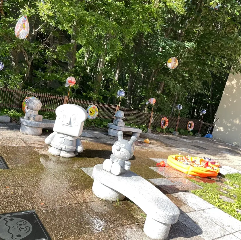 入口には御影石製のかわいいキャラクター像や噴水があり、写真を撮ったり、水遊びをしたりと、入る前から子どもたちの笑顔が絶えません。