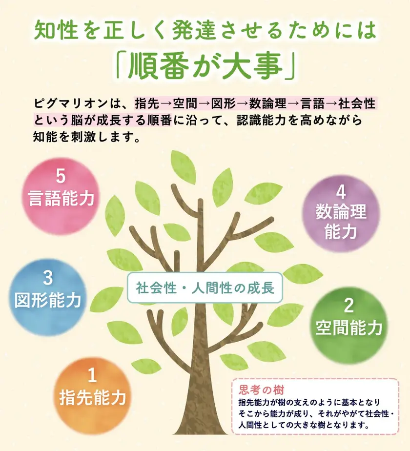 ピグマリオンとは、大阪を拠点とするピグマリオン学育研究所所長の伊藤恭氏が開発した幼児教育メソッドのこと。指先能力から空間能力、図形能力、数論理能力、そして言語能力へと、脳が成長する順番に沿って知能を刺激していくことで、高い知性と感性、人間性を育んでいくというものです。