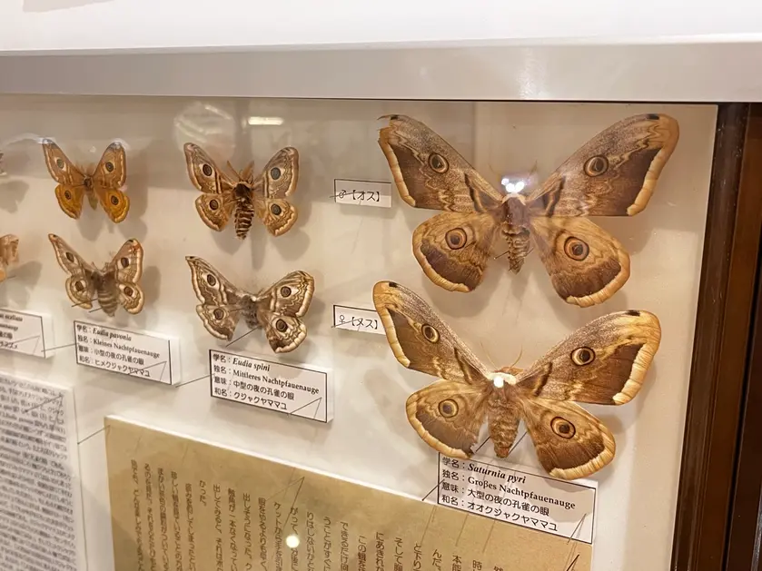 物語の中心である「クジャクヤママユ」も展示されており、物語を知る人にとっては”本物”に触れる感動もひとしおでしょう。粉々につぶされた蝶の模型などは偽物ですが、その他の標本は全て本物を使用しています。