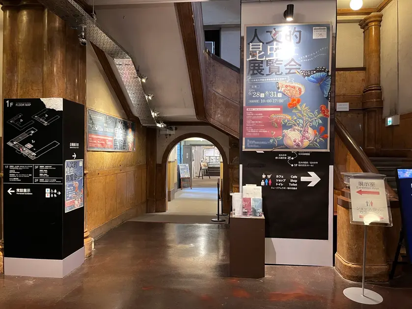 展示室手前にある企画展の看板が目印です。通路の壁には本展に関連する昆虫の図版が飾られているため、そちらも注目してみてください。