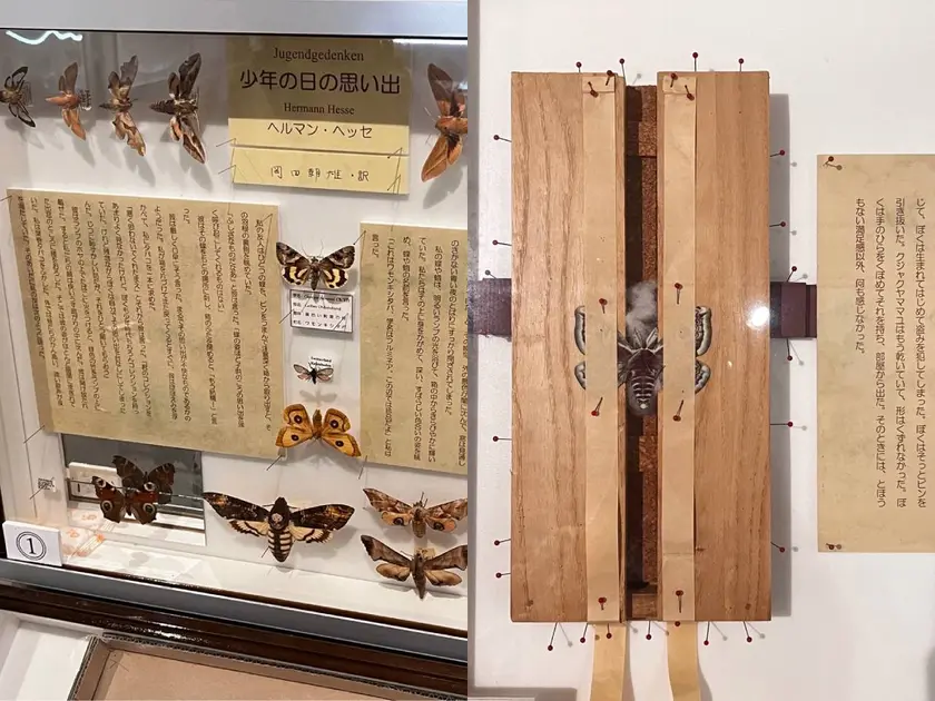 実際の蝶・蛾類の標本を用い、作家ヘルマン・ヘッセの短編小説『少年の日の思い出』の世界を表現しています。国語の教科書にも掲載されていた作品で、来場者の中には登場人物「エーミール」の名を懐かしむ人の姿も見られました。