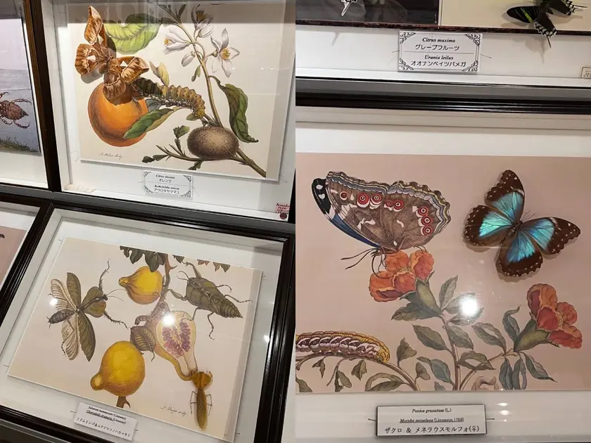 マリーア・ズィビラ・メーリアンが1705年に著した『スリナム産昆虫変態図譜』と、その図譜に描かれた昆虫の標本を組み合わせて展示しています。実物と重ねても違和感のないほど精緻な図版に、思わず目を奪われてしまいます。