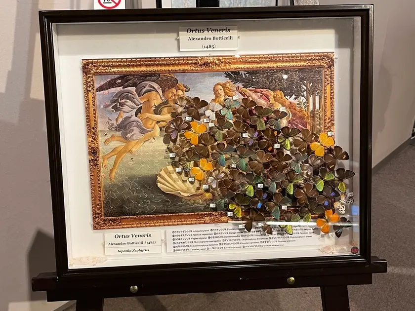 ボッティチェリ『ヴィーナスの誕生』の図版上に数多のシジミチョウの標本が飾られたこちらの作品を見てみましょう。シジミチョウ科に属する一群は「ゼフィルス」の俗称で親しまれており、これはギリシャ神話の西風の神「ゼピュロス」に由来しています。この絵画の左端に描かれている男神こそが、その「ゼピュロス」です。