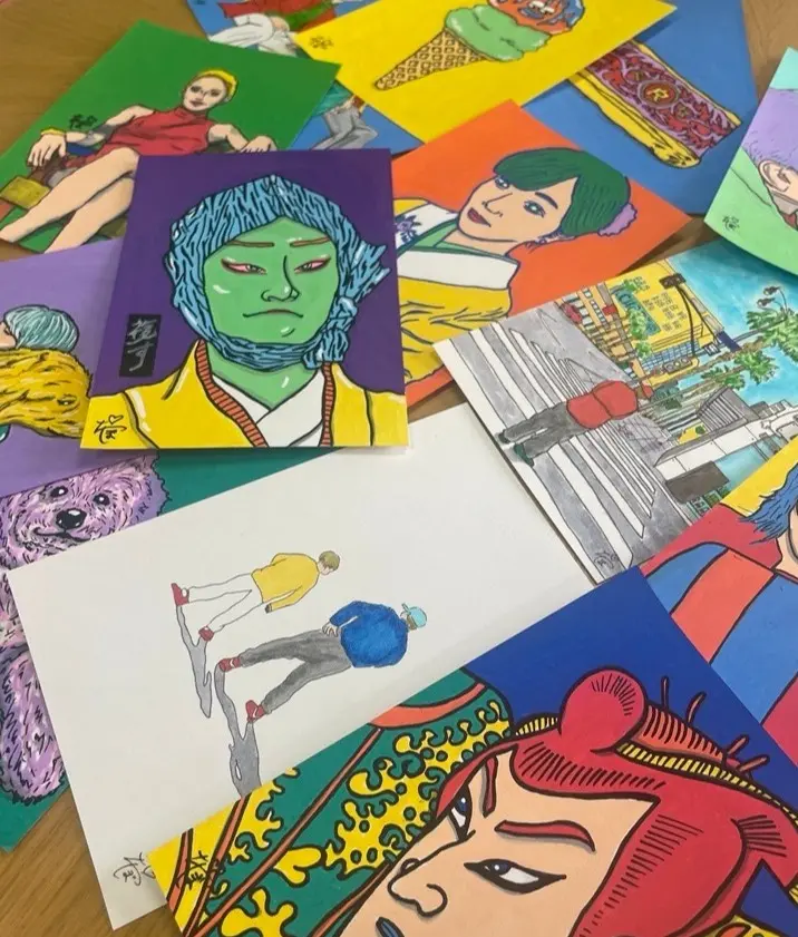 ちゃぼさんが本格的にアート制作を始めたのはコロナ禍の頃。メモ帳に描き始めた小さなイラストがきっかけでした。やがて「右脳を活性化させたい」というふとした動機から、左手で描くことを取り入れるようになり、次第にその“ぎこちなさ”や“味わい”が彼女のアートの個性へと昇華していきます。