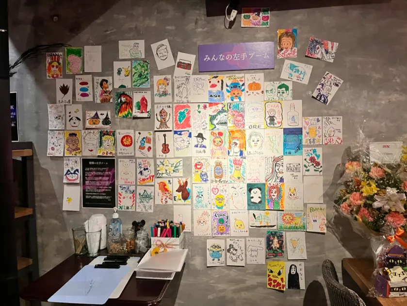 本展では、来場者が自由に左手で絵を描ける体験コーナーも設けられています。完成した作品は会期中に展示スペースに追加されていき、まさに“育っていくミュージアム”。