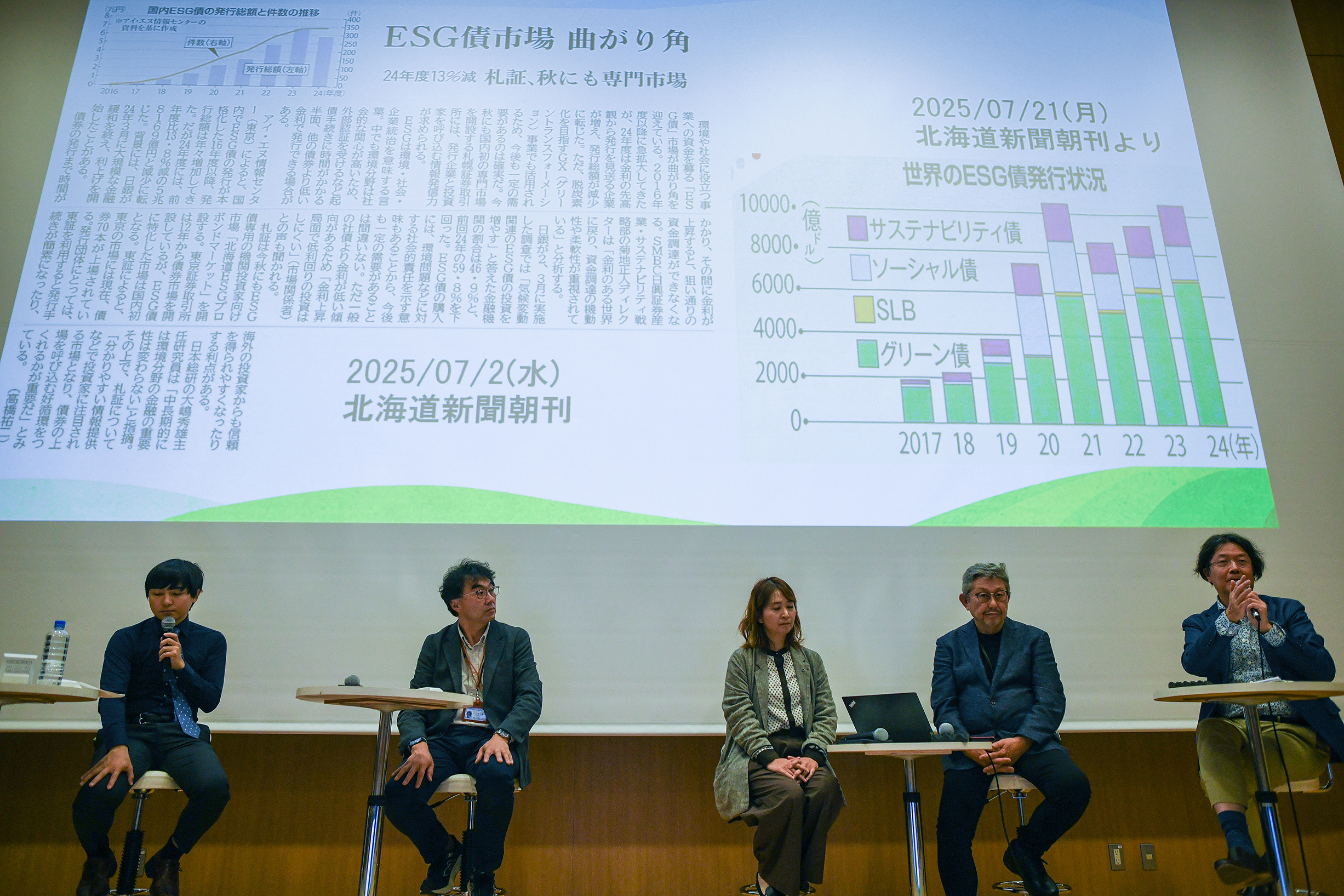 鈴木:例えば学生のみなさんなら、これから就職する企業や自治体などで、環境負荷や温暖化ガスを減らす取り組みを進めること。あるいは消費者として、そうした取り組みに熱心な企業の商品を優先的に買うことが有効です。実は、そうした企業をきちんと評価し、成長させていく取り組みはすでに始まっています。環境・社会・企業統治の改善に取り組む企業を選んで投資する「ESG投資」という投資手法です。ESG投資の金額はすでに全世界で1兆ドルを超え、逆に環境などを重視しない企業が資金を集められない世の中になりつつあります。その意味で、札幌市はとても先進的です。昨年、国のGX金融・資産運用特区に認定され、ESG投資資金を世界中から集め、道内や全国、アジアに供給する「マネーセンター」を目指しています。このように、みなさんの身近な選択や行動は、企業の行動を、さらには世界のお金の流れまで変えていくのです。