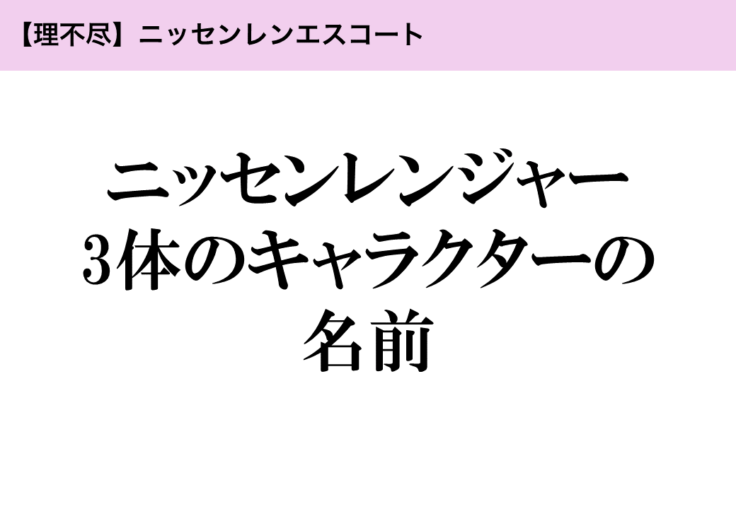 ニッセンレンエスコート:ニッセンレンジャー3体のキャラクターの名前(理不尽級のため、ノーヒント)