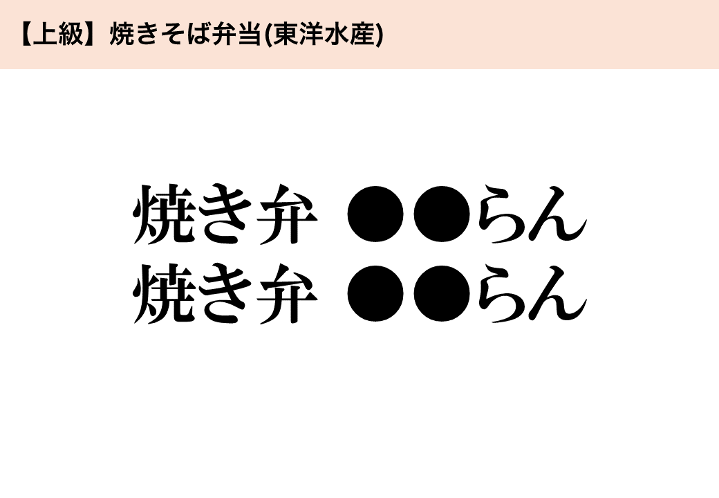 焼きそば弁当「焼き弁 ●●らん 焼き弁 ●●らん」(それぞれひらがな2文字、異なる言葉)