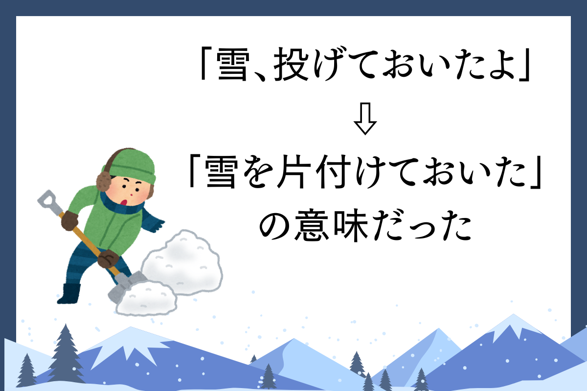 「雪、投げておいたよ」=雪を片付けておいた、の意味だった