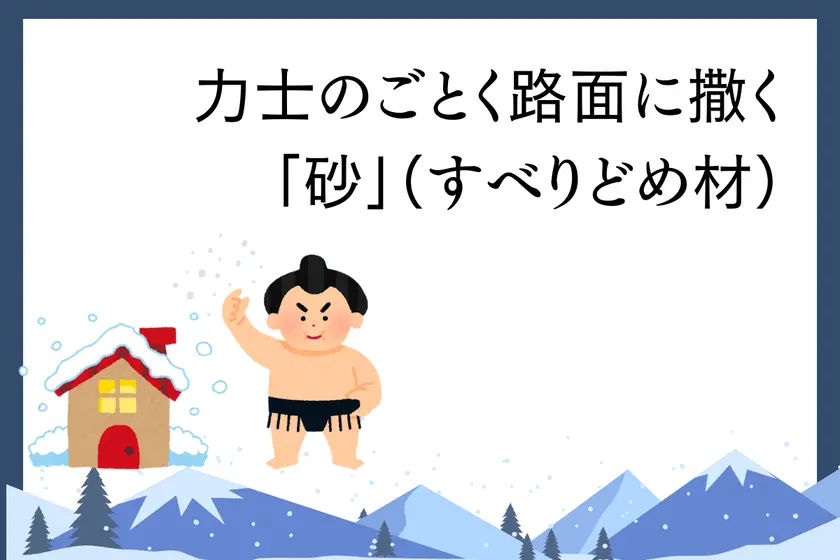 北海道では道路が凍るため、凍結防止剤だけではなく、すべりどめの砂(小石)を大量に撒く。交差点には砂箱が設置され、後に歩く人のために砂を撒いて歩いていく。その光景はまるで土俵で塩をまく力士のごとく。