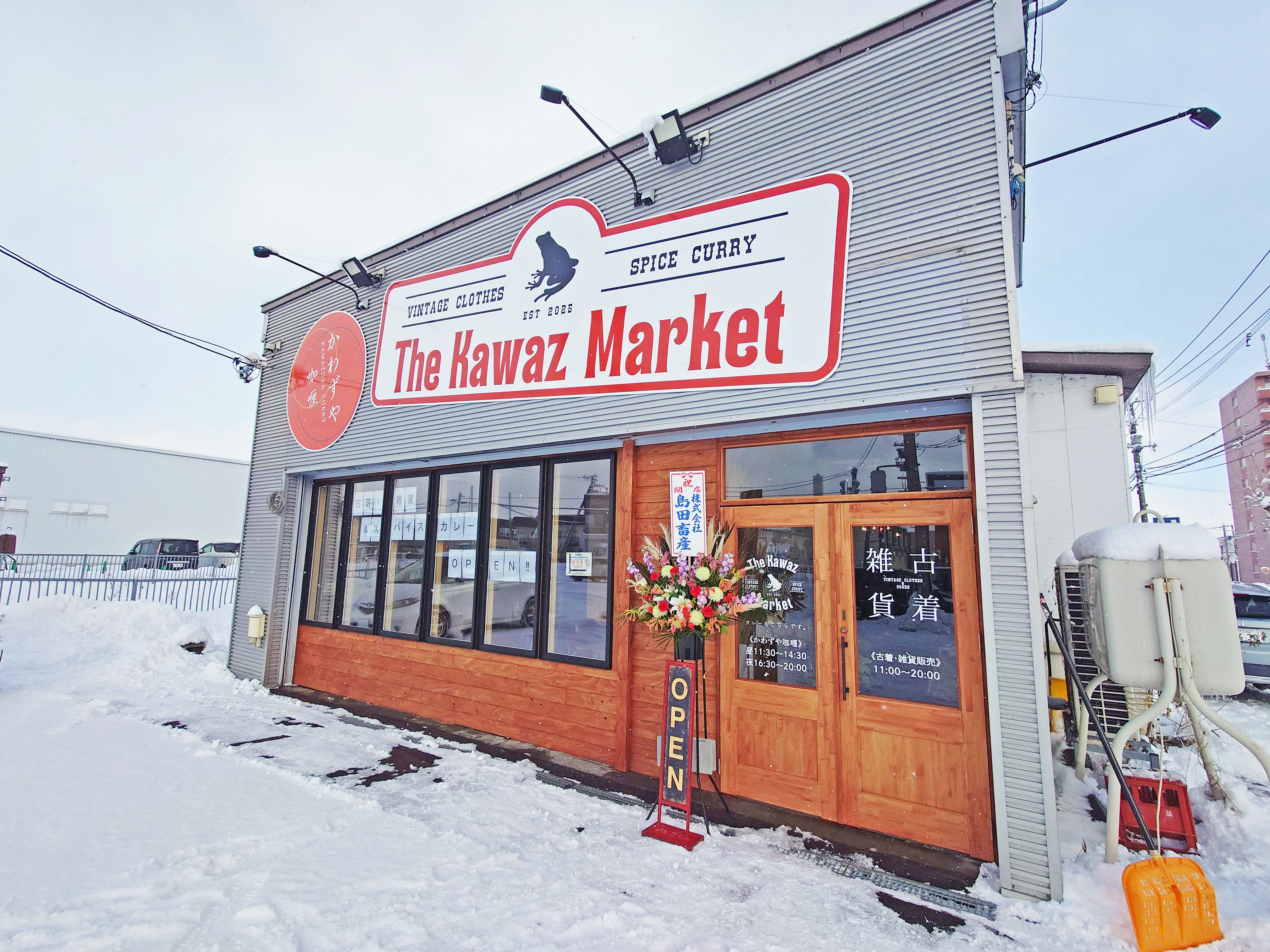 2025年12月15日、旭川の緑町にグランドオープンした「The Kawaz Market」(ザ・カワズマーケット)」。パッと見は爬虫類ショップと見間違えそうな看板だが、古着とカレーを扱う、少しユニークな店舗だ。