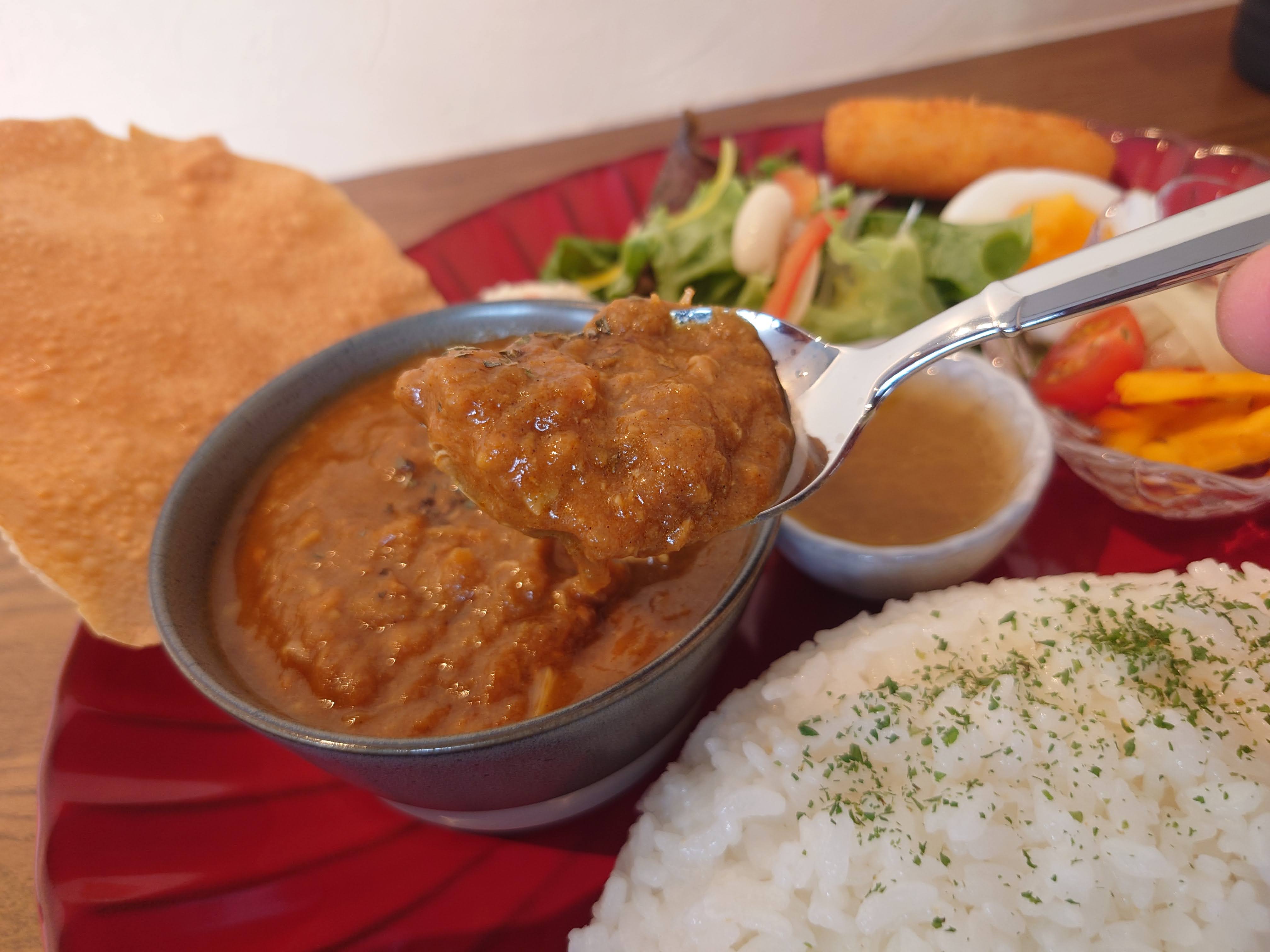 食べると、深いコクとフルーティーな甘さ。チキンは大きさで主張するのではなく、小さめでもしっかりとした存在感!スパイスは効いているが、辛さは控えめ。付け合わせにゆで卵やポテトコロッケもあり、最後まで飽きずに食べ進められる。