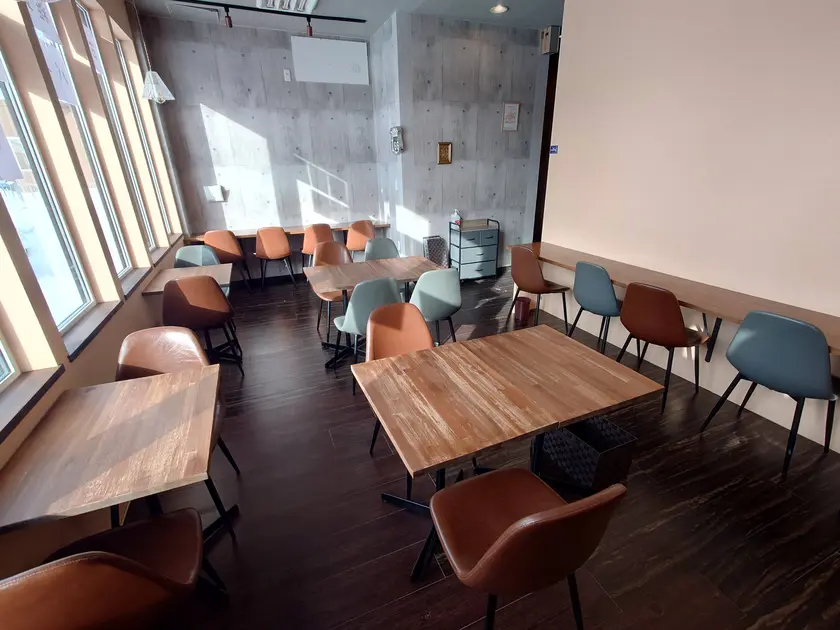 いざ、カレー屋のスペースへ!天井まで届く大きな窓が印象的で、想像以上に明るい。装飾は控えめだが、自然と長居したくなる空気感。デート使いにも悪くない。ちなみに注文と会計は、古着屋さんのレジカウンターで、先に済ませるスタイル。オープンしたばかりで、ドリンクなどはまだ品数が少ないが、今後に期待したい。
